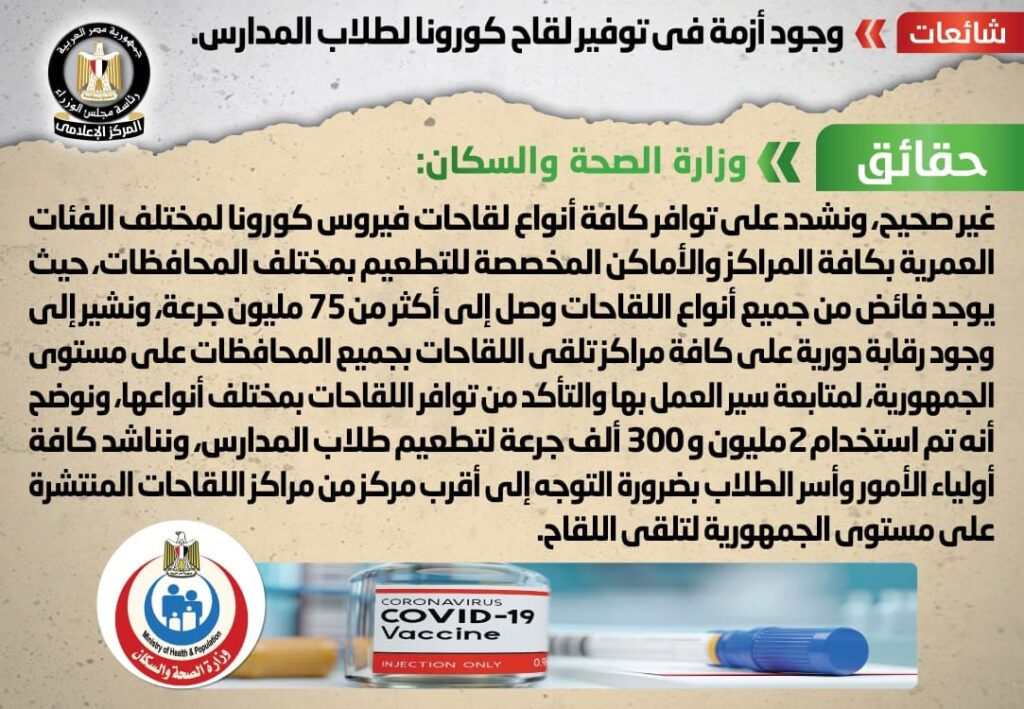 وانتشر في بعض المواقع الإلكترونية وصفحات التواصل الاجتماعي أنباء بشأن وجود أزمة في توفير لقاح كورونا لطلاب المدارس.