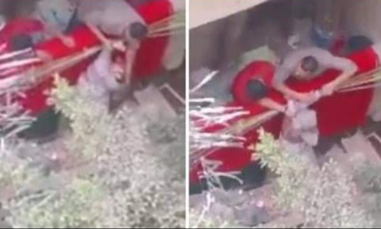 ظهر الأب في المقطع الفيديو، ممسكًا بابنته من رأسها ونصف جسدها خارج الشرفة محاولًا إلقائها فيما تشبثت الفتاة بقوة في حبل الغسيل.